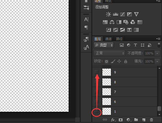 一、第一种方法,适用于图层并不是太多情况下,鼠标悬停在图层1的眼睛处,按下鼠标左键,然后向上滑动。
