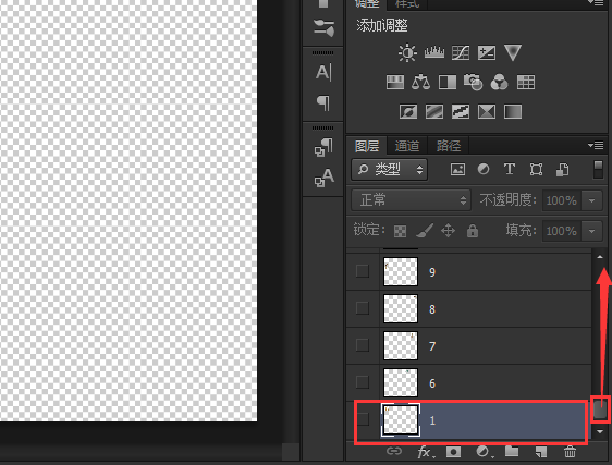 三、第二种方法,鼠标点击选中第一个图层,然后图层滚动条滚动到顶部。