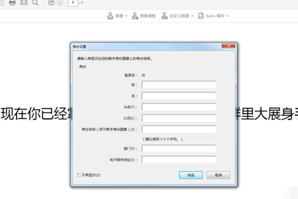 3、加盖图章时,会弹出身价设置,输入你的姓名等信息后点击完成,开始加盖图章;