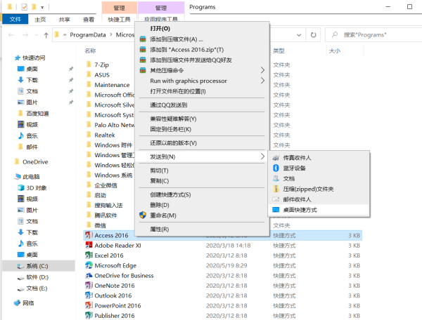 打开后,右键单击 Access 2016 图标,选择“发送到”“桌面快捷方式”