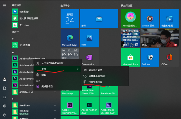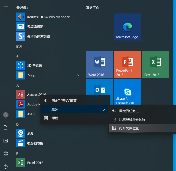 在开始里面找到 Access2016后,右键单击此图标,选择“更多”,选择“打开文件位置”