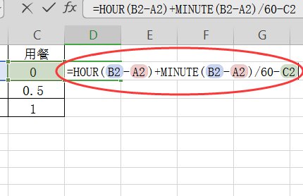 HOUR(B2-A2)+ MINUTE(B2-A2)/ 60-C2。 165,如下图所示。