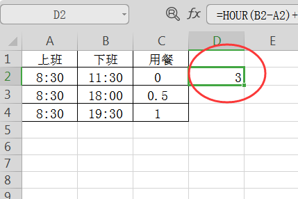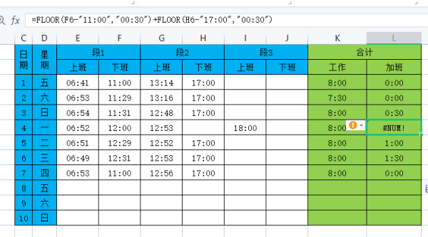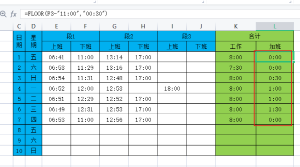 公式:=FLOOR(F3-"11:00","00:30")的意思就是:按照半个小时取整,我修改了你上午的下班时间,目的是演示给你看,当然你需要根据你公司的规则来修改。