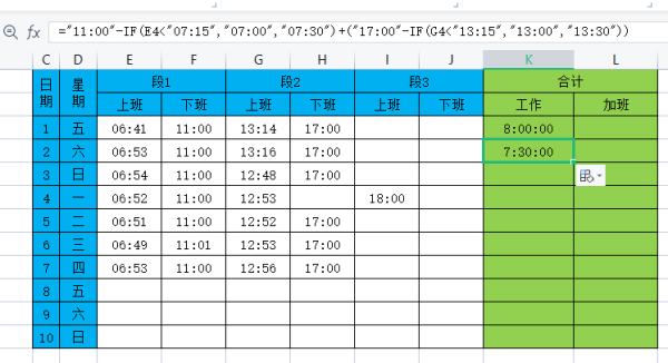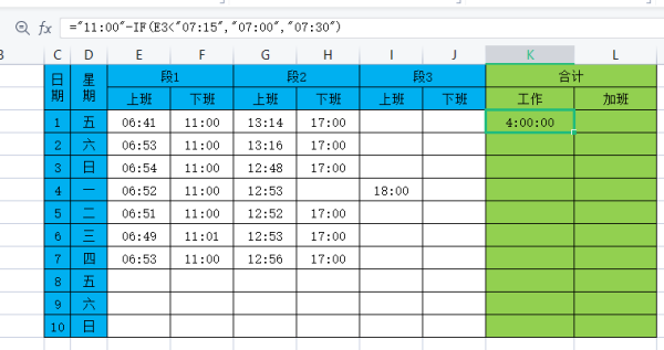 公式:="11:00"-IF(E4<"07:15","07:00","07:30")+("17:00"-IF(G4<"13:15","13:00","13:30"))