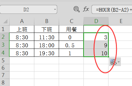 这个公式会计算出工作小时数,然后将结果以小时数的形式显示在列E中。确保将公式应用到所有适用的行上。