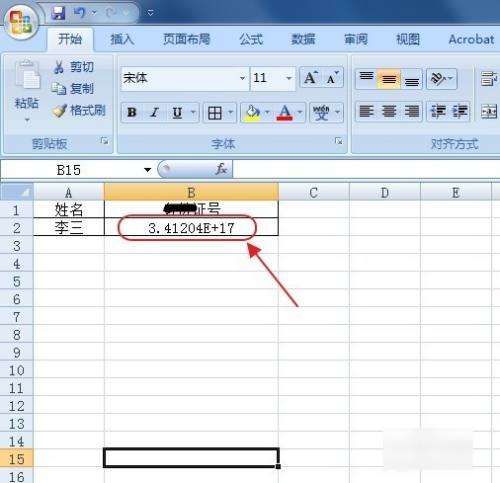 1、打开电脑中的一个excel文档,然后在其中一个单元格中输入18位的身份证号码,可以看到该号码并不能正确显示,如下: