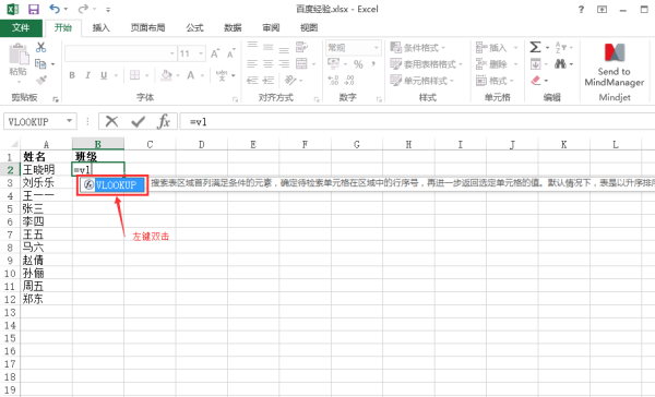 4、在单元格中输入“=vl”,然后会自动提示出VLOOKUP函数,双击蓝色的函数部分。