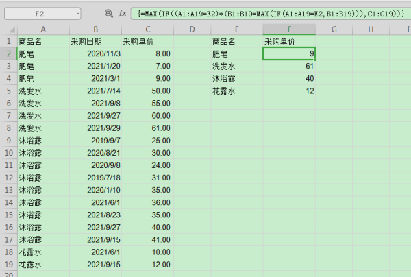 简单点的话,把商品名称做主要关键字,采购日期做次要关键字做下升序排列。则使用下面公式:
