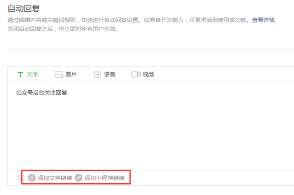 添加好小程序连接,快速自动回复就可以推送小程序了。