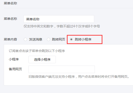 1.打开自定义菜单之后,你可以在这里设置菜单,选择一个菜单。不要选择有子菜单的母菜单 2.选择好了一个菜单之后,你会看到右边除了菜单名称设置,还有菜单内容设置,选择跳转小程序。 3.选择了跳转小程序后点击选择小程序,在公众号已经绑定的小程序里选择一个。 4.选择了小程序后你可以看到小程序路径,填入备用网址,然后就可以保存发布了。(路径可以自己在小程序开发者工具获取,或者通过公众号文章获取)微信公众号如何跳转到小程序 公众号和小程序连接方式