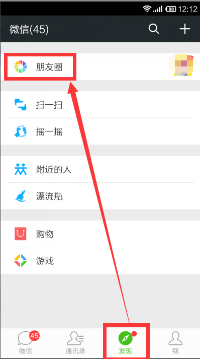 第一步,在微信发现页面,打开“朋友圈”界面。(如下图所示)