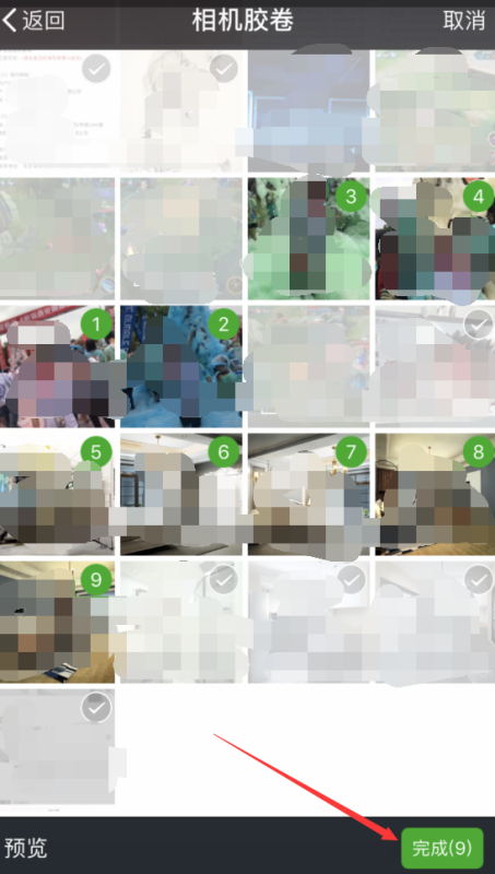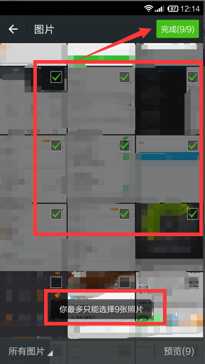 在打开的“图片”界面,选择手机内的9张照片,再点击选择第十张照片,会提示“最多只能选择9张照片”的了,选好照片之后,点击“完成”的按钮;