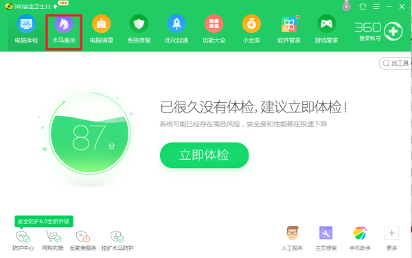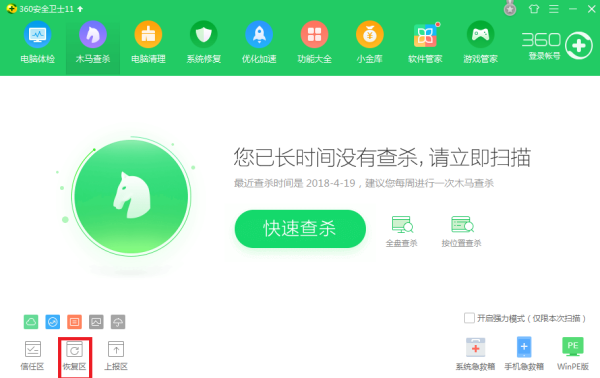 2、进入木马查杀后,点击该页面左下角的选项-恢复区。