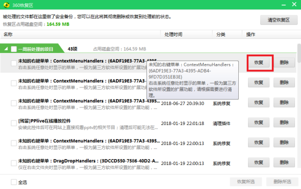 3、进入恢复区之后,显示已经强删除的文件列表,选择要恢复的文件,点击旁边的恢复按钮,文件恢复。