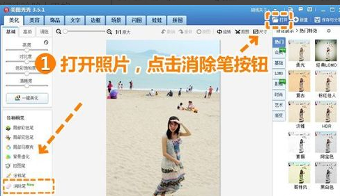 1、在“美图秀秀”中打开一张待处理的照片,点击“美化-消除笔”;
