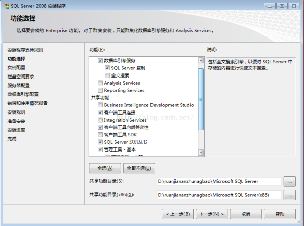 (2)功能选择,对于只安装数据库服务器来说,功能的选择上可以按实际工作需要来制定,本人一般选择:数据库引擎服务、客户端工具连接、SQL