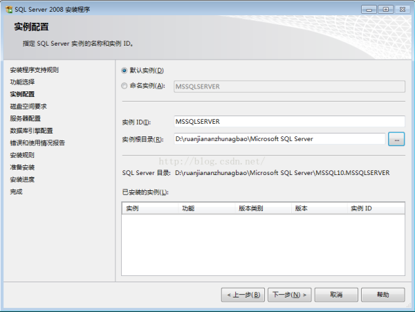 (3)实列设置,可直接选择默认实例进行安装,或则若同一台服务器中有多个数据服务实列可按不同实列名进行安装。如图: