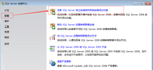 (1)进行SQL Server安装中心,选择"安装"选项,在新的电脑上安装SQL2008可以直接选择“全新SQL Server独立安装或向现有安装功能",将会安装一个默认SQL实列,如下图: