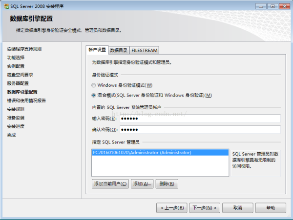 Server系统管理员帐户(sa)的密码比较特殊,SQL2008对SA的密码强度要求相对比较高,需要有大小写字母、数字及符号组成,否则将不允许你继续安装。在"指定Sql