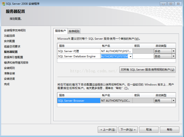 (4)服务器配置,服务器配置主要是服务启动帐户的配置,服务的帐户名推荐使用NT AUTHORITY\SYSTEM的系统帐户,并指定当前选择服务的启动类型,如图: