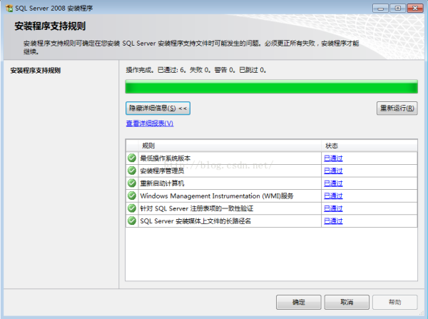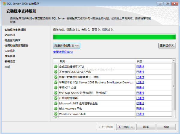 安装时应该注意:要保证全部通过,有一个通不过就不能继续安装,应该检查注册表,把错误的清理一下,重新安装。