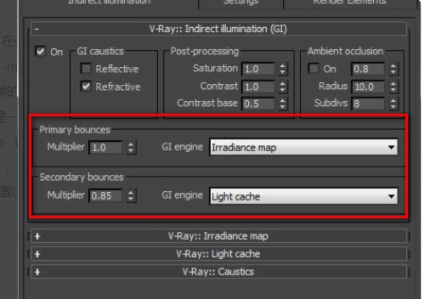 4、在然后不管是测试渲染还是正式渲染,Indirect illumintion 下都勾选【on】,然后multiplier跟一下的图片设置就好了