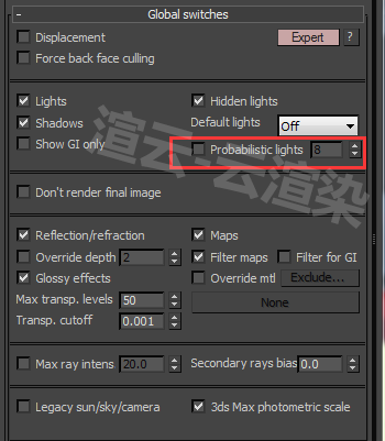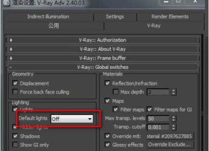 2、设置好渲染器后,要注意3d设置有测试渲染和正式渲染,正式渲染的参数需要比测试渲染的参数搞,因此在vray-Global switches 下lights选【off】,在测试渲染下勾选override mel:在正式渲染下不勾选override mel。