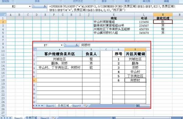 6、接着,完成上述步骤后,当“1000 7、最后,完成上述步骤后,当“10000 提问上图必须要有行列标号的,否则没有办法看清楚表格的数据结构和做公式的! 你若要研究做一个自动识别的片区经理公式,就要有一个明确的片区关键词,这样操作就简单了,如上图,只要在M2单元格输入公式: =IFERROR(VLOOKUP("*"&LOOKUP(1,0/ISNUMBER(FIND(负责区域!$E$2:$E$7,K2)),负责区域!$E$2:$E$7)&"*",负责区域!$A$2:$B$4,2,0),"找不到") 复制并下拉,即可自动生成对应片区的负责人了。
