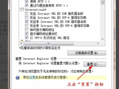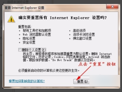 3、接下来需要点击“重置”按钮,将对IE浏览器进行重置。
