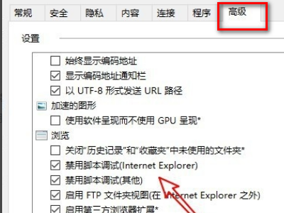 4、这时就会打开IE浏览器的Internet属性窗口,在窗口中点击“高级”的选项卡。在打开的高级窗口中找到“禁用脚本调试(InternetExplorer)”与“禁用脚本调试(其他)”的设置项。