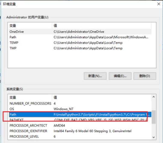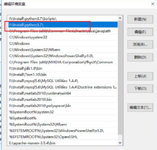 4、在path中添加上python的安装路径,这里是F:\Install\python3.7\,需要注意的是如果要是有pip安装第三方库的话,需要添加F:\Install\python3.7\Scripts\到变量中。