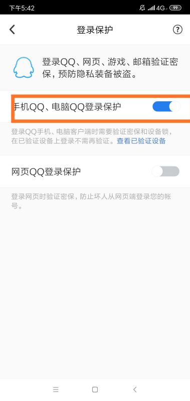 3、在弹出的界面中,找到“手机QQ、电脑QQ登录保护”的选项,如下图。