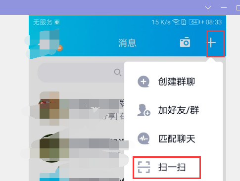 二、然后打开手机QQ消息界面,点击右上角“+”,弹出菜单中点击“扫一扫”。
