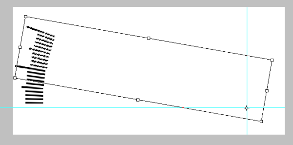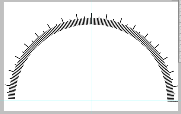 5.复制图层,再划一长方形选区,自由变换,变换角度5度,变换原点在辅助线中心点。并把最上面10度刻度线延长,如下图:这样一组刻度线就制作成功了。