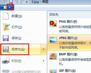3、然后在画图中点击左上角白色的小三角,选择“另存为”--“JPEG图片”。