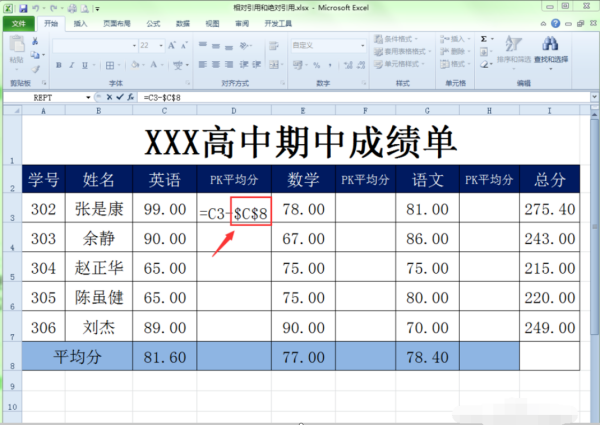 设置绝对引用步骤7:例如:如果要在每个人总分后加上表现分28分,在单元格J3的公式为“=I3+C14