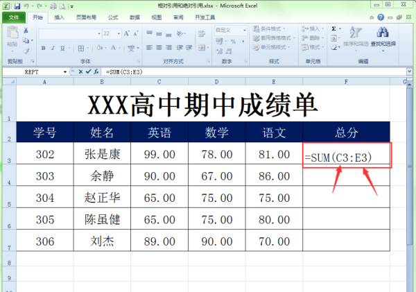 1、相对引用是Excel中常用的一种引用方式。相对引用的格式为:列号行号,如“A1”、”F26“等。在下面F3单元格中的公式“=SUM(C3:E3)”就是用的是相对引用。