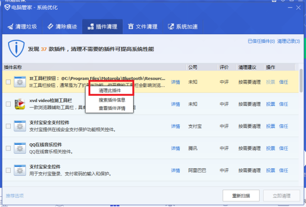 在弹出的窗口中找到这款插件, 右键选择”清理此插件“即可。