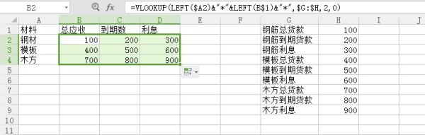 需要截取关键字进行模糊提取,给你举个例,如下图所示:要提取G列对应的H列值,因为A列内容与G列不一致,故需要截取关键字进行提取,截取A列的左边第1个字,再截取B1:D1的左边第一个字,用任意符号(*)连接起来,达到只要在G列发现“钢"和"总"、"钢"和"到"、“钢"和"利"、“模"和"总"、“模"和"到"..........两字就符合条件,从而提取H列的值。所以在我示图中,只要在B2单元格输入公式=VLOOKUP(LEFT($A2)&"*"&LEFT(B$1)&"*",$G:$H,2,0)