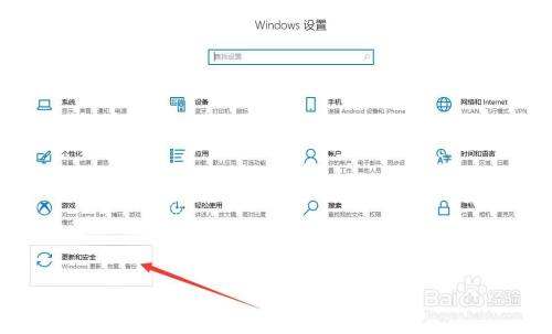 在”Windows设置“界面中,点击”更新和安全“项进入。
