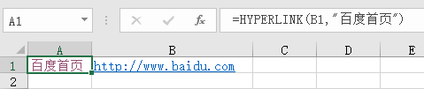 启动excel软件,在A1单元格输入公式:=HYPERLINK(B1,"百度首页"),在B1单元格输入百度首页地址,再点击A1单元格,就会打开百度首页。