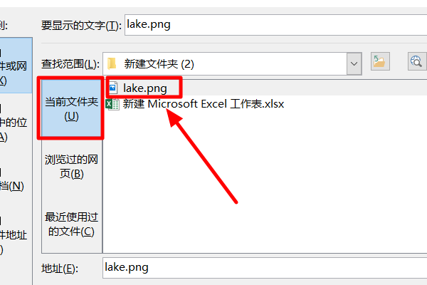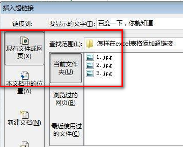 3,在插入超链接的窗口中,选好左侧的“当前文件夹”,然后再选中刚刚放到文件夹中的图片。