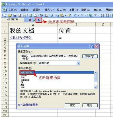 1、用鼠标点击需要建立超链接的单元格——点击函数图标——在打开的函数对话框中找到超链接函数“HYPERLINK”,点击打开。