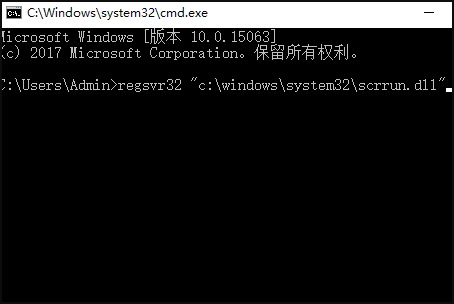 2、然后在dos窗口中,输入命令:regsvr32 "c:\windows\system32\scrrun.dll" ,按下enter键。