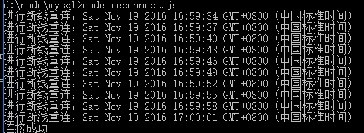 首先关闭mysql服务,然后执行程序,会一直打印断线重连,当再次开启mysql服务后,打印连接成功。