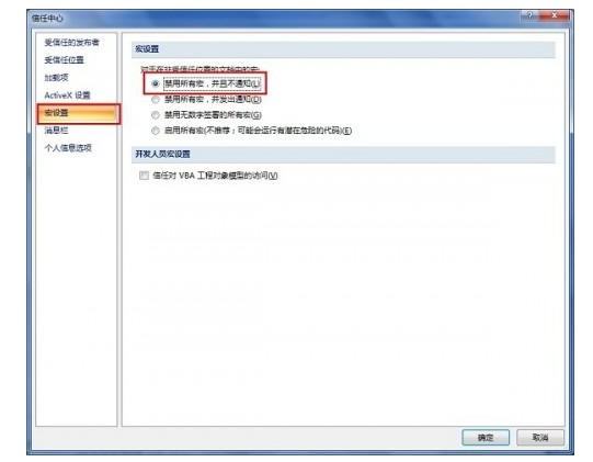 3. 点击“宏设置”,选择“禁用所有宏,并不通知”;