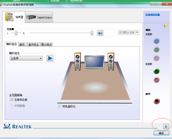 2、在Realtek高清晰音频管理器窗口中点击右下角的i图标。