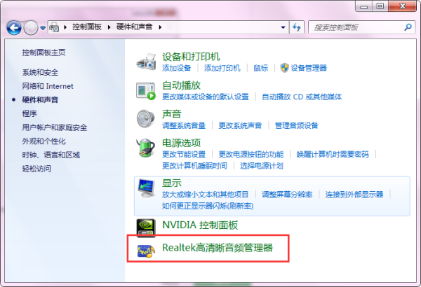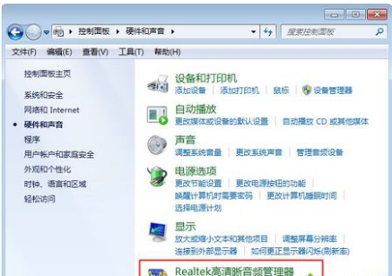 1、如果声音图标依然打红叉,则依次点击开始按钮—控制面板—硬件和声音—Realtek高清晰音频管理器;