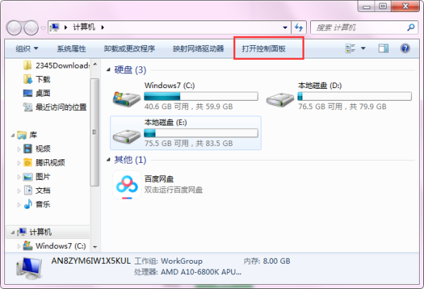 一、按下WIN+E键打开计算机,然后点击“打开控制面板”。