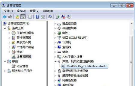 1、在桌面上,右键点击“计算机”—“管理”—“设备管理器”—“声音、视频和游戏控制器”,查看Realtek High Definition Audio是否显示正常,如果红叉或黄色感叹号,说明没有安装驱动;